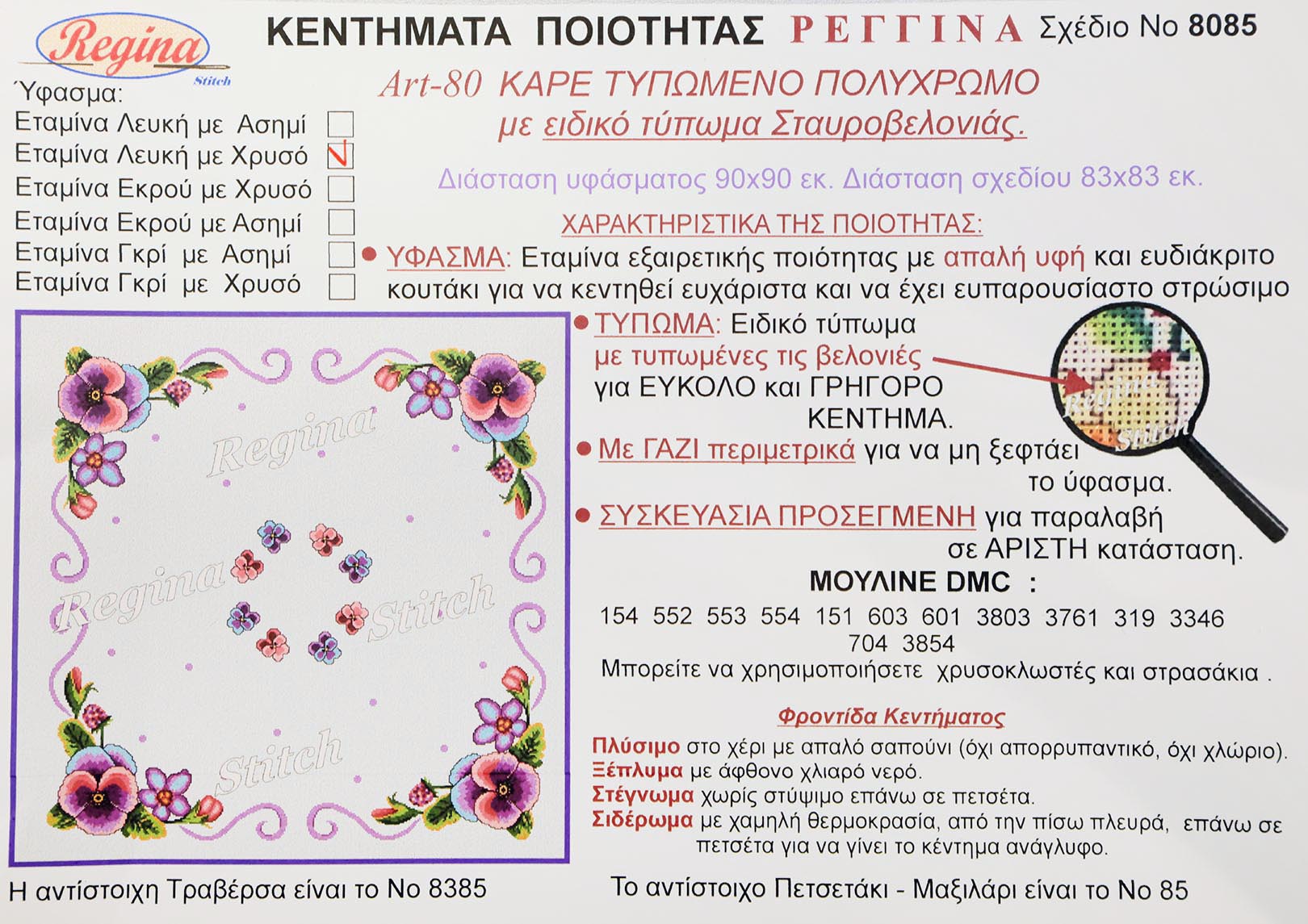 Προτεινόμενες Κλωστές DMC και Χρυσοκλωστές: 154 | 552 | 553 | 554 | 151 | 603 | 3803 | 3761 | 319 | 3346 | 704 | 3854